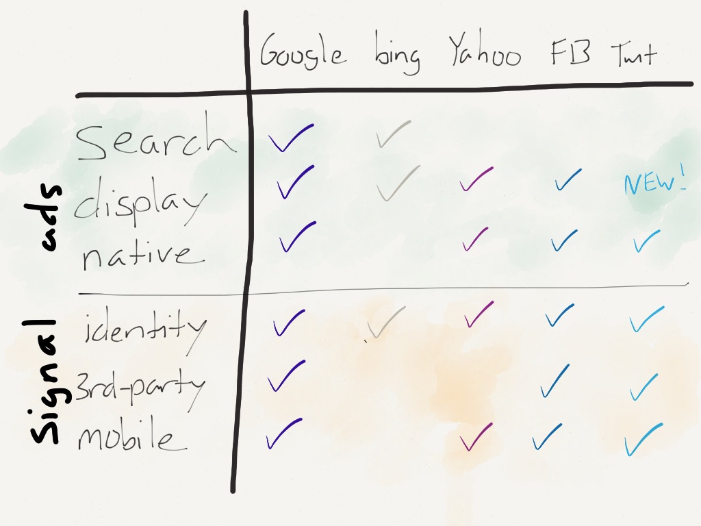 At the time, Yahoo had lots of ads, but almost no signal at all; Twitter had the opposite problem. Great signal, some interesting native advertising, but not many other advertising channels.