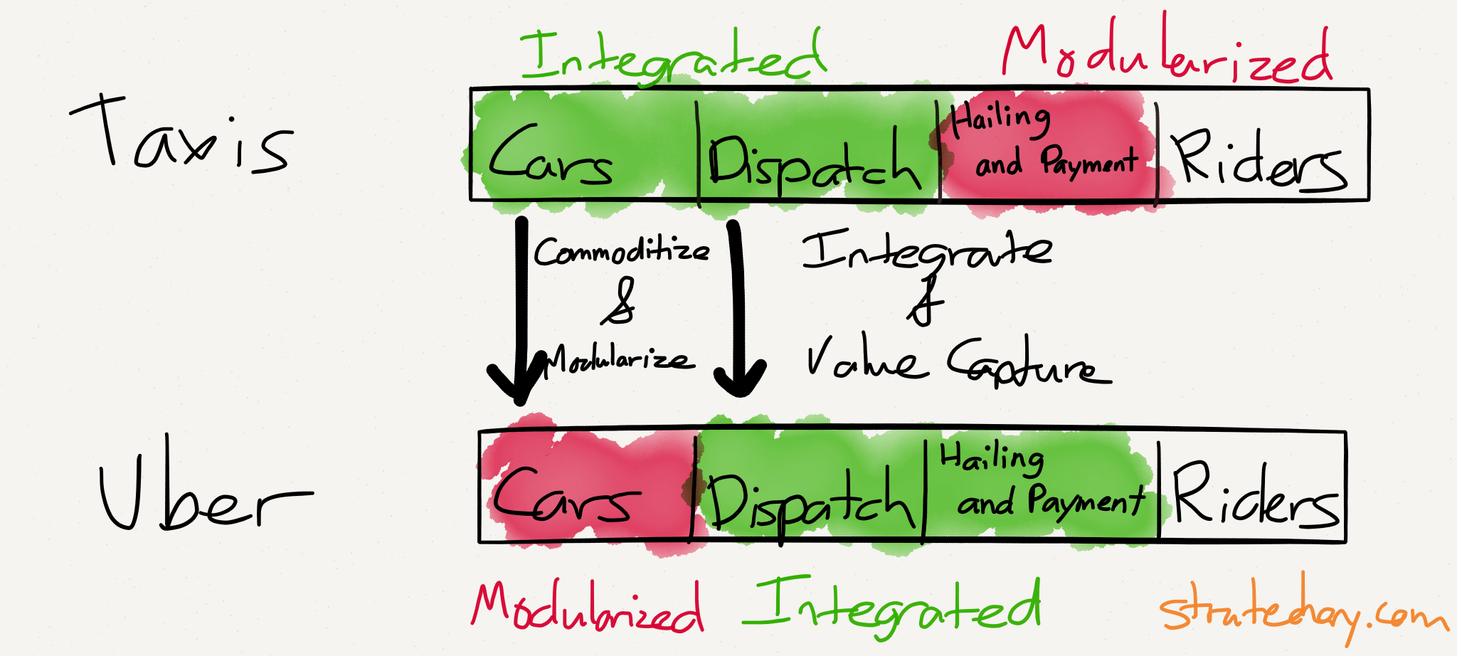 Uber has a trust element as well (as do nearly all the sharing companies), but even more important was how the service commoditized dispatch and modularized cars: