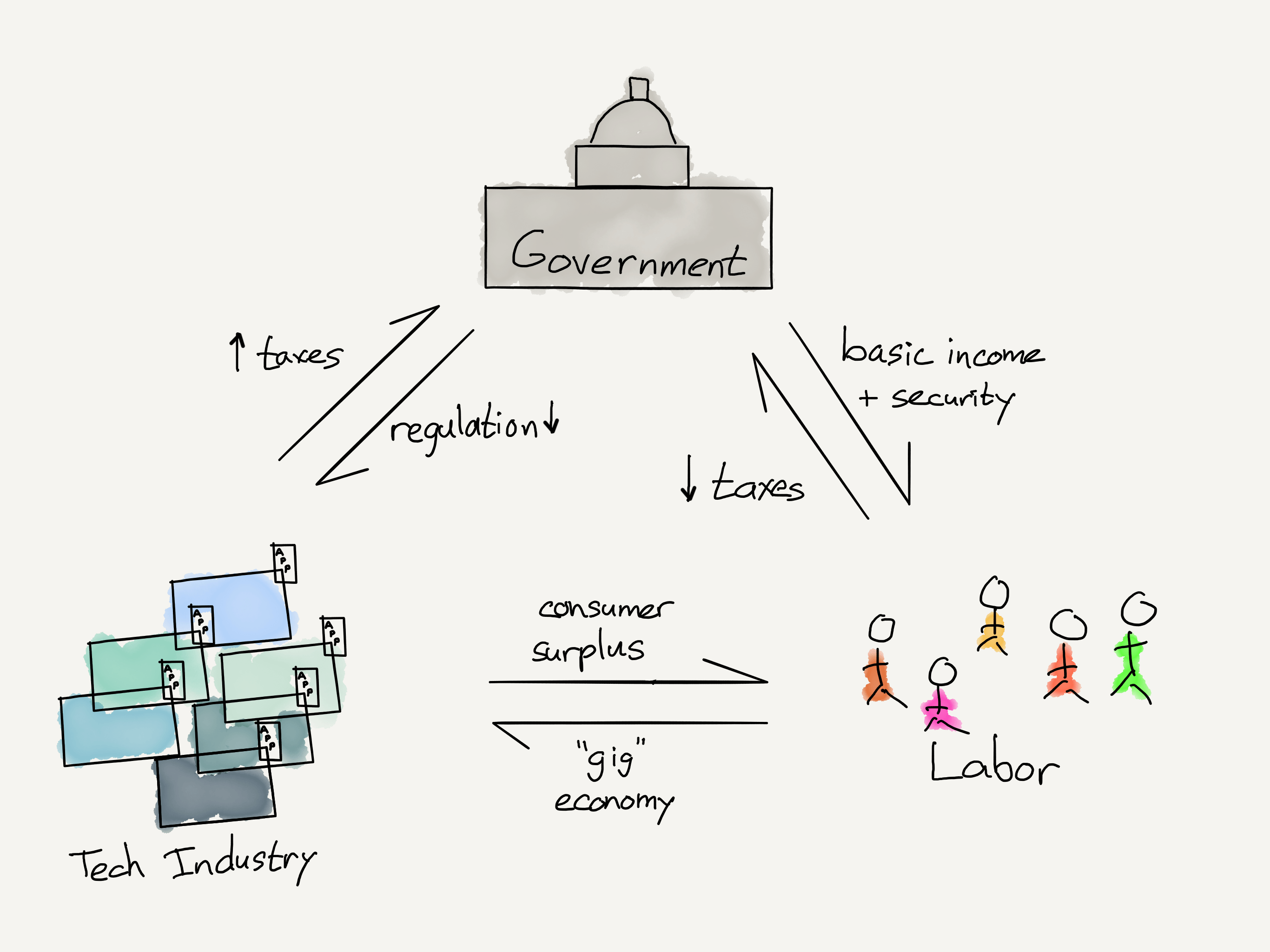 The first implication of the supranational nature of technology is that unlike the old multinationals, there is no need for government support to open markets and guarantee trade; for the most part, the less government involvement the greater maximization there will be of the consumer surplus that is already being generated. Rather, it is the government that ought take a much more active role in supporting individuals.