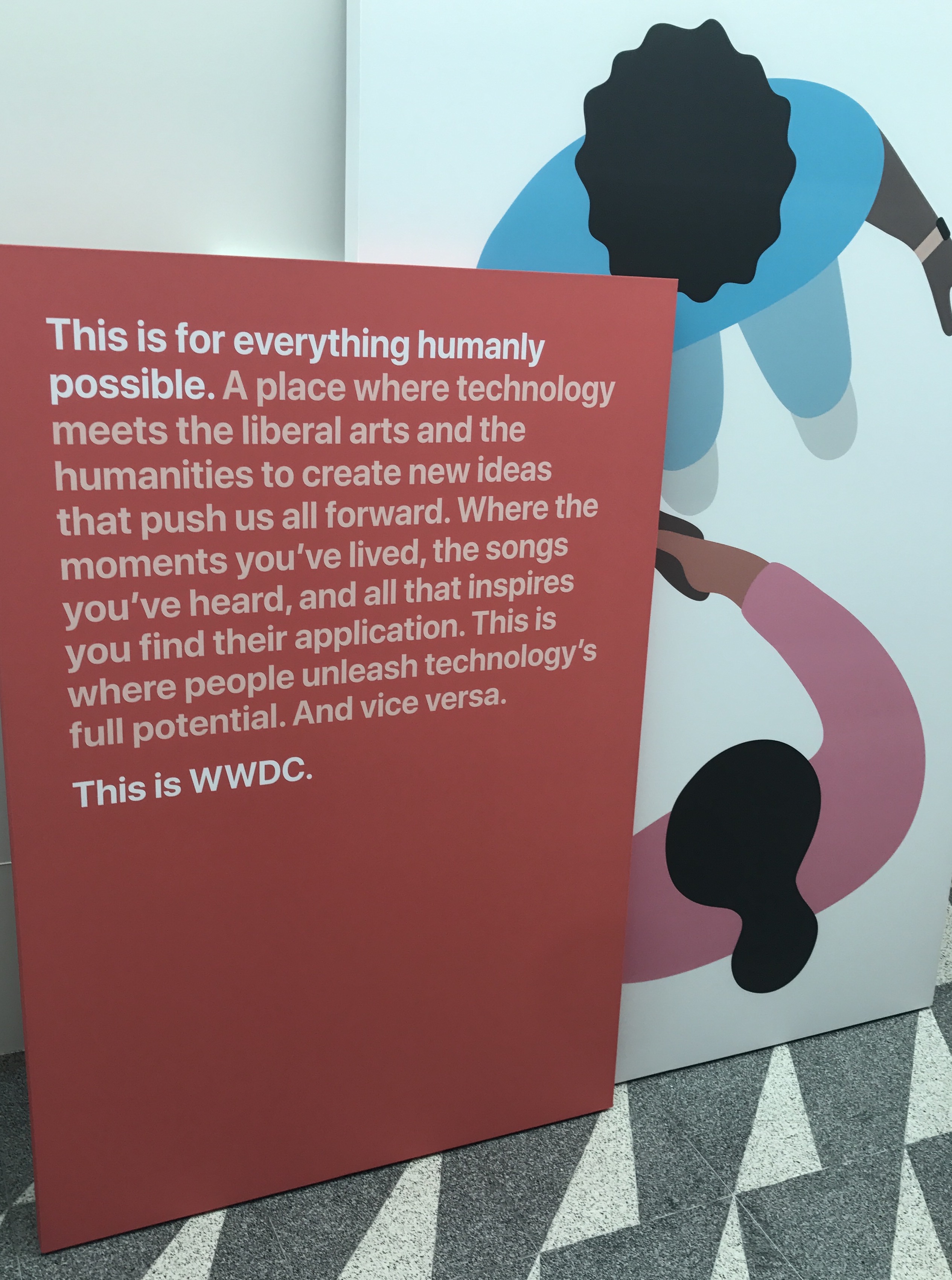 The San Jose location of WWDC, Apple’s annual developer conference, felt a bit odd, but Apple sought to strike a familiar tone: the artwork on and around the San Jose McEnery Convention Center featured a top-down view of humans, and a familiar message: