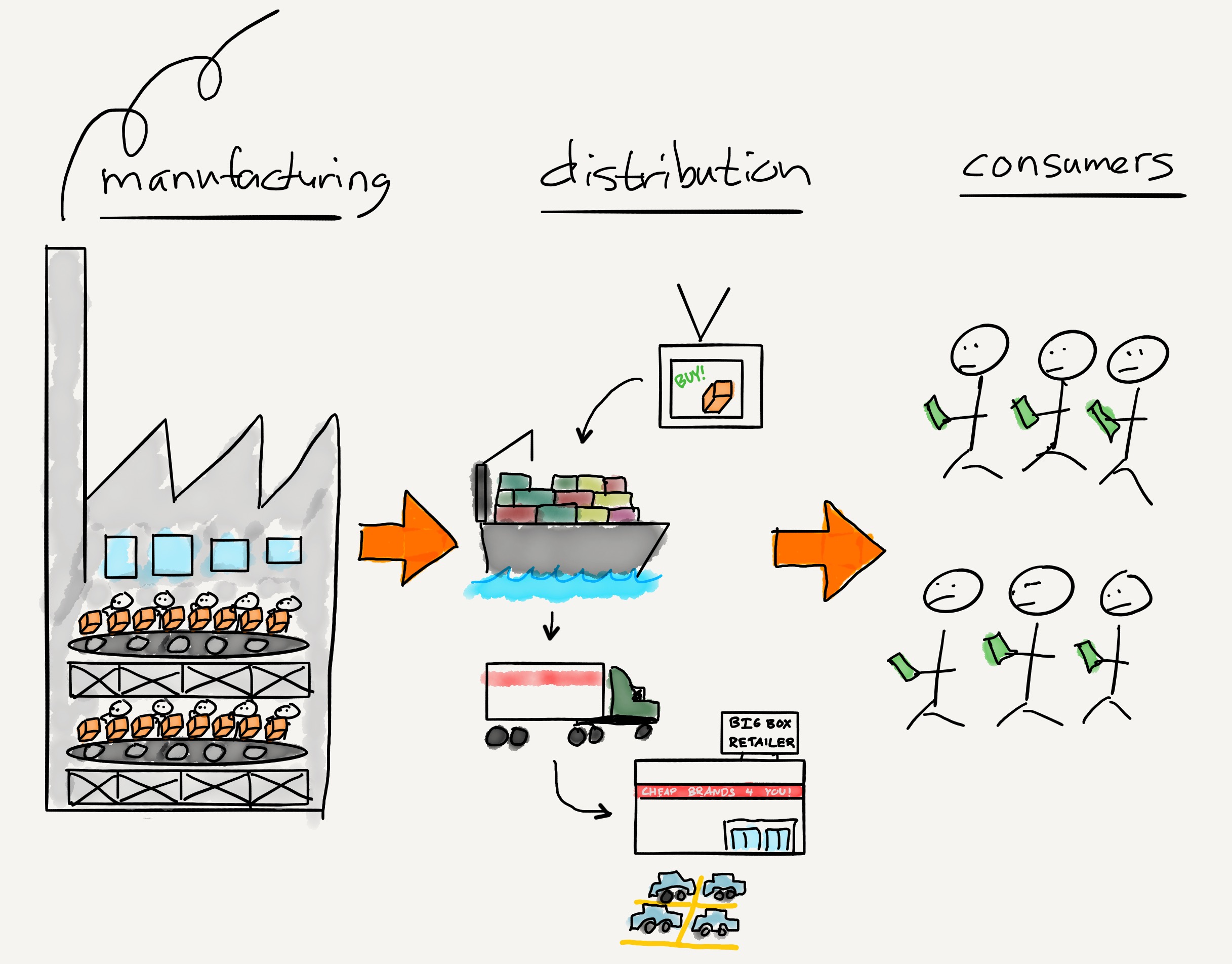 However, for most products this has not been the case for well over a century; first the industrial revolution and then the advent of the assembly-line method of manufacturing resulted in an abundance of products. The new source of economic power became distribution: the ability to get those mass-produced products in front of customers who were inclined to buy them: