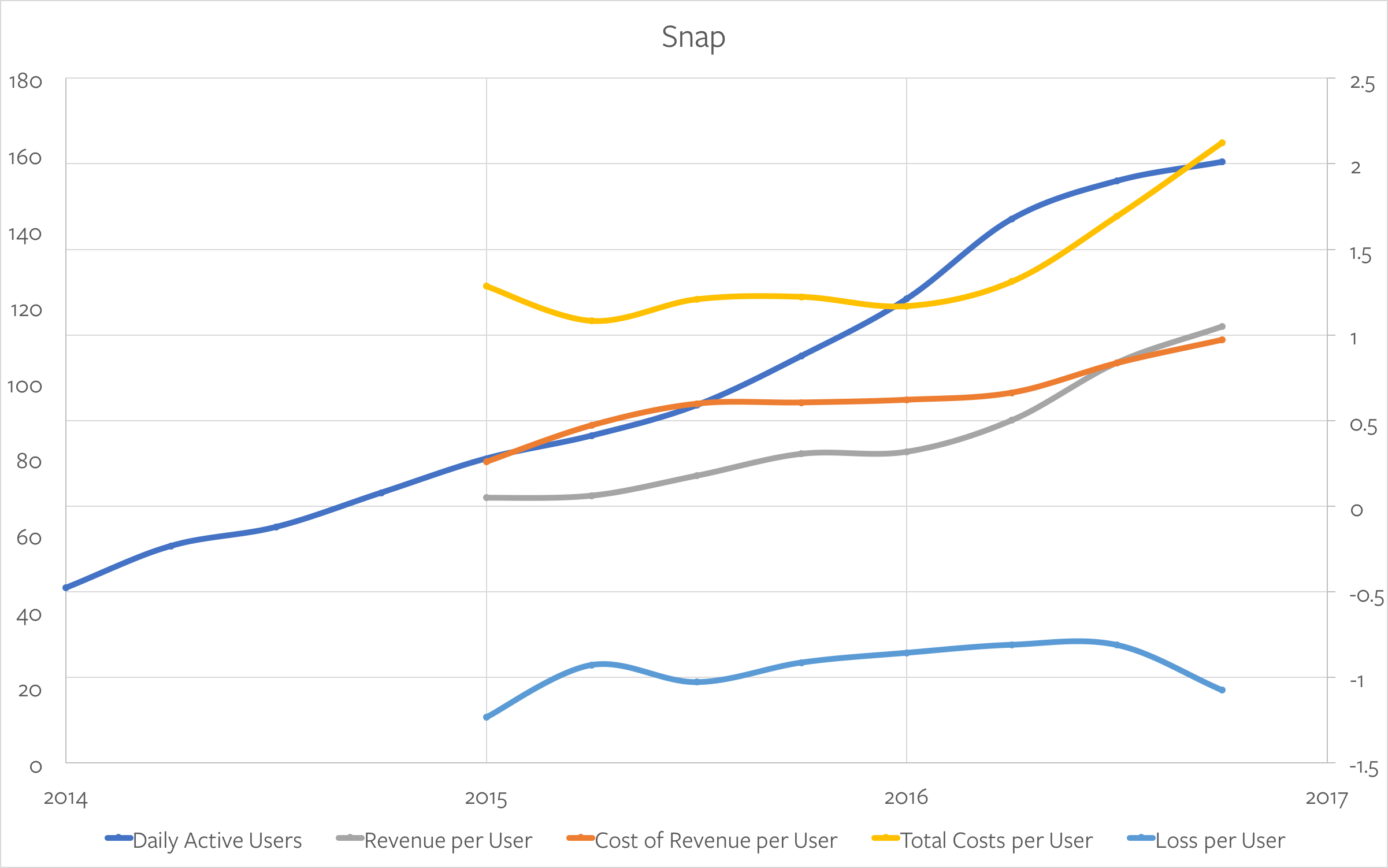The biggest problem here is Snap’s cost of revenue per user: it’s going up, and it has been for a while. This isn’t quite as bad as it seems, because Snap’s cost of revenue includes revenue sharing payments to publishers; once you back that out, though, the company has gone from paying ~$0.47/user in 2015 to ~$0.66/user in 2016, a 40% increase, and an amount (per user) that well exceeds that of Facebook or Twitter at the time of their IPOs. That means that to become profitable Snap has to not only grow users, it has to grow them faster than its costs are increasing, or grow revenue per users by that much more.