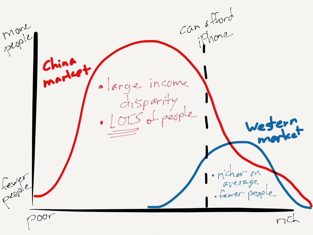 There are a couple of interesting nuggets here. First, the iPhone introduced the very idea of subsidization to China. I’m not surprised to hear this, as this was also the case in Taiwan. My last smartphone before the iPhone was the Nokia N73, for which I paid about $600 dollars from a phone dealer, and paired it with a $20/month contract from a carrier. That was totally normal. The iPhone, though, was introduced in Taiwan with a subsidy and higher monthly plan, which is now commonplace.
